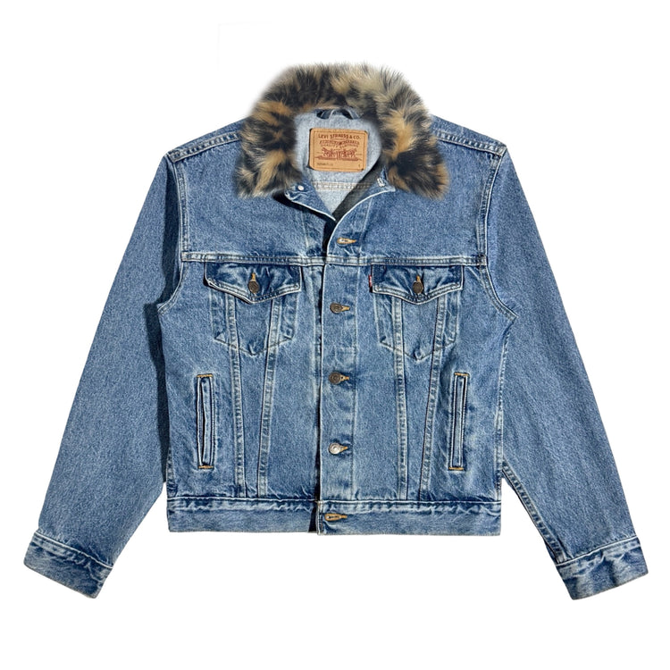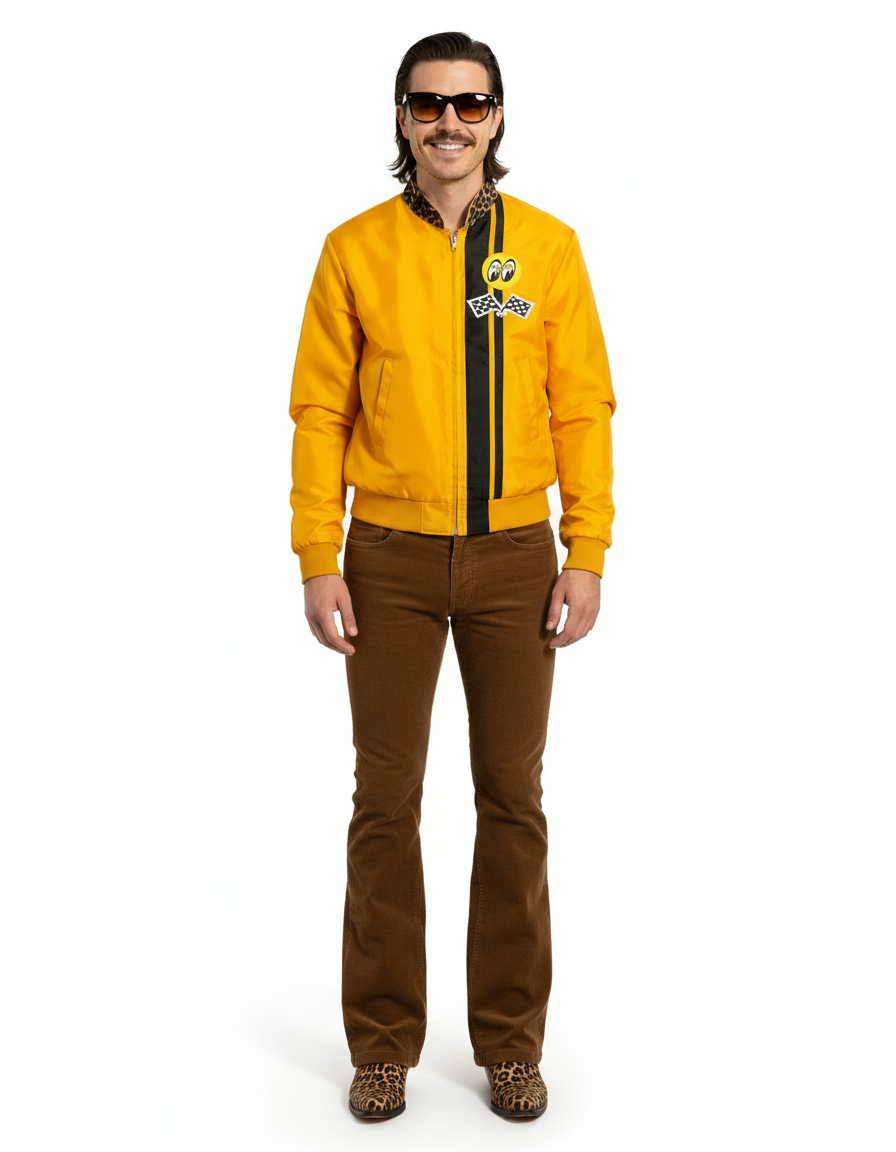 1970’S MOON RACING MADE IN USA CROPPED LEOPARD PRINT PONY HAIR COLLAR STRIPED RACING JACKET MEDIUM