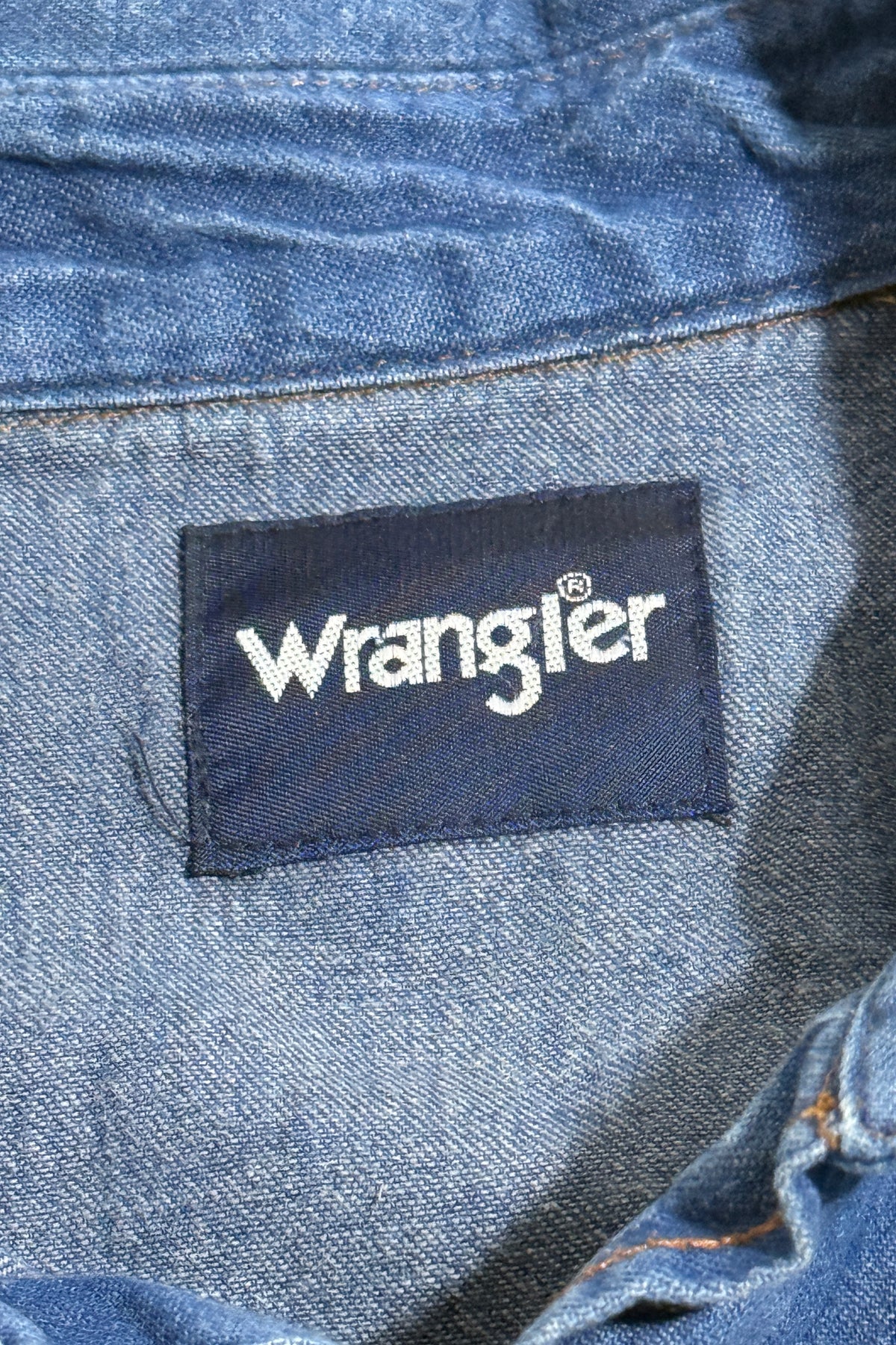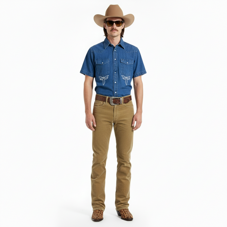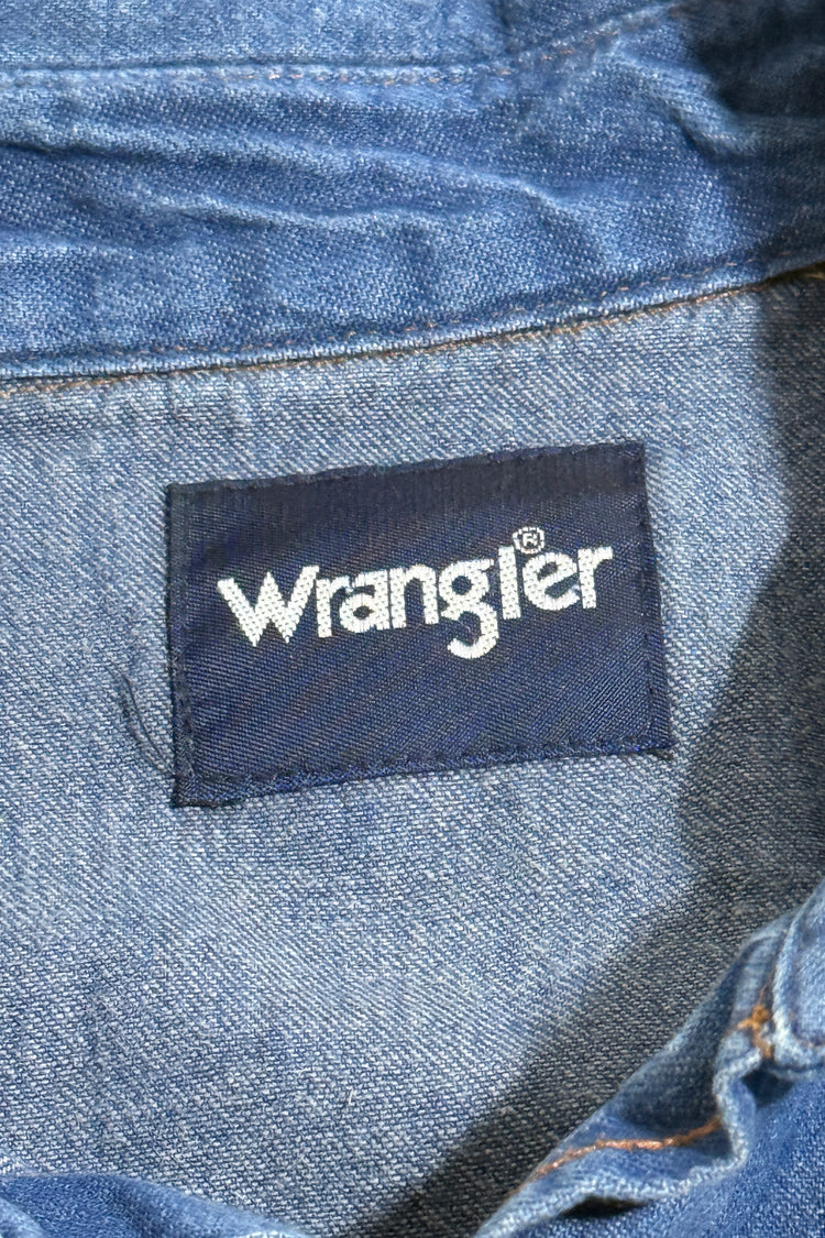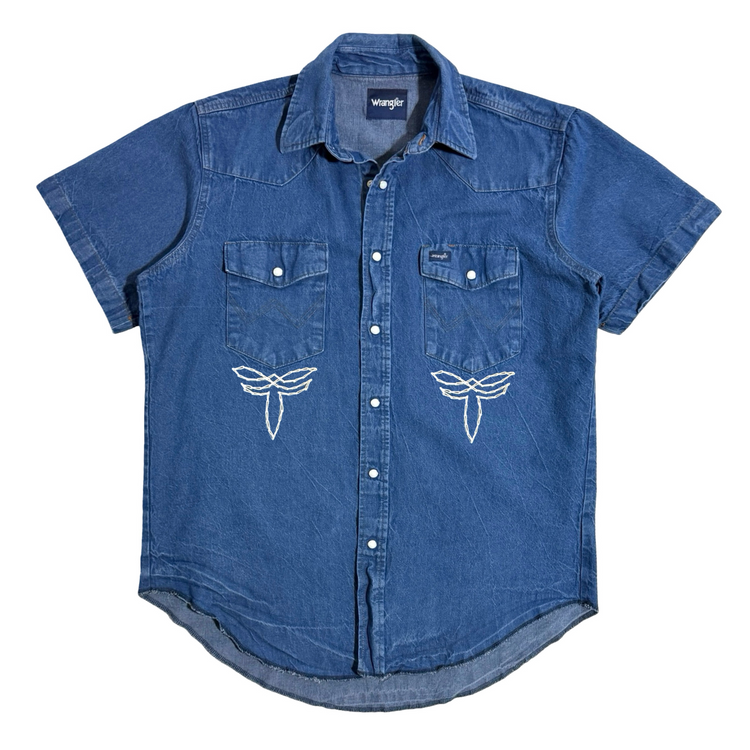 MASK X WRANGLER MADE IN USA HAND CHAINSTITCHED WESTERN S/S PEARL SNAP DENIM SHIRT LARGE