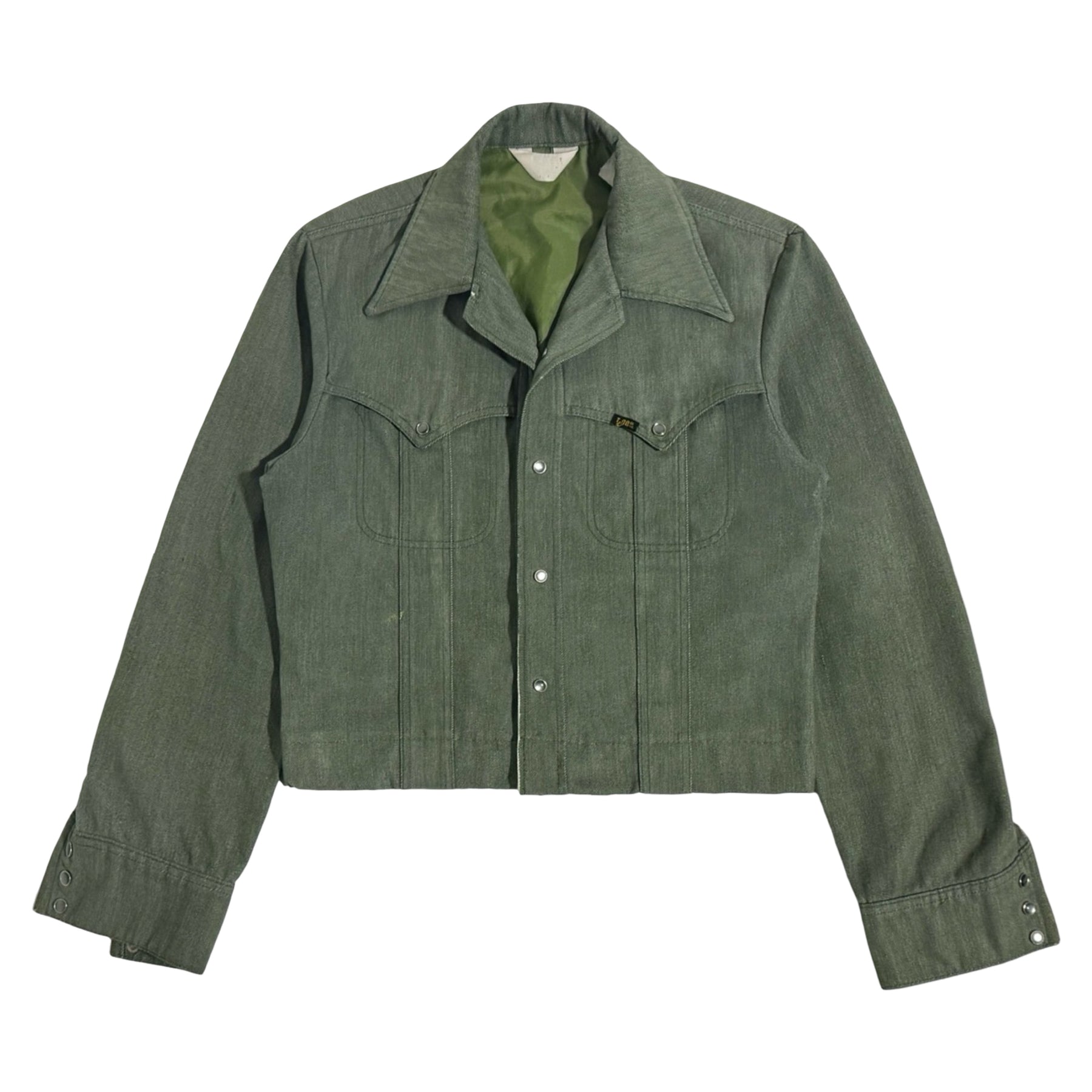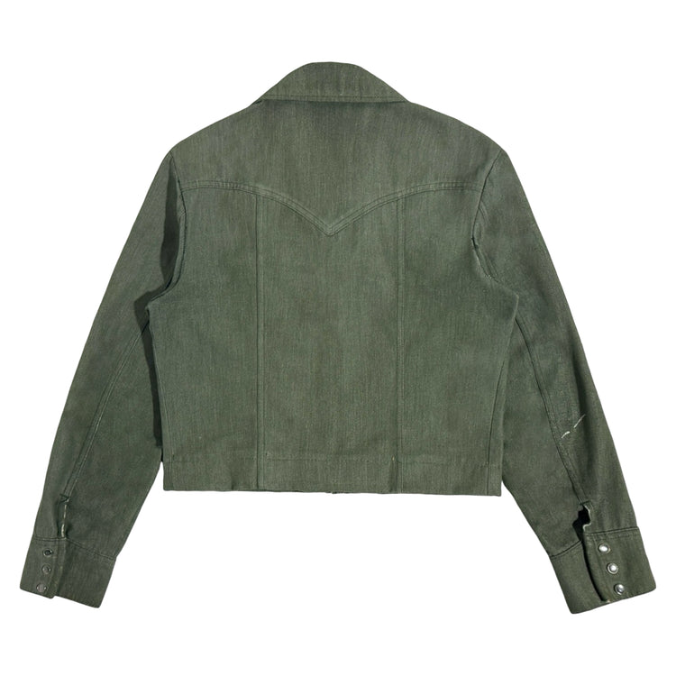 1970’S LEE RIDERS MADE IN USA CROPPED OLIVE DENIM WESTERN PEARL SNAP TRUCKER JACKET MEDIUM