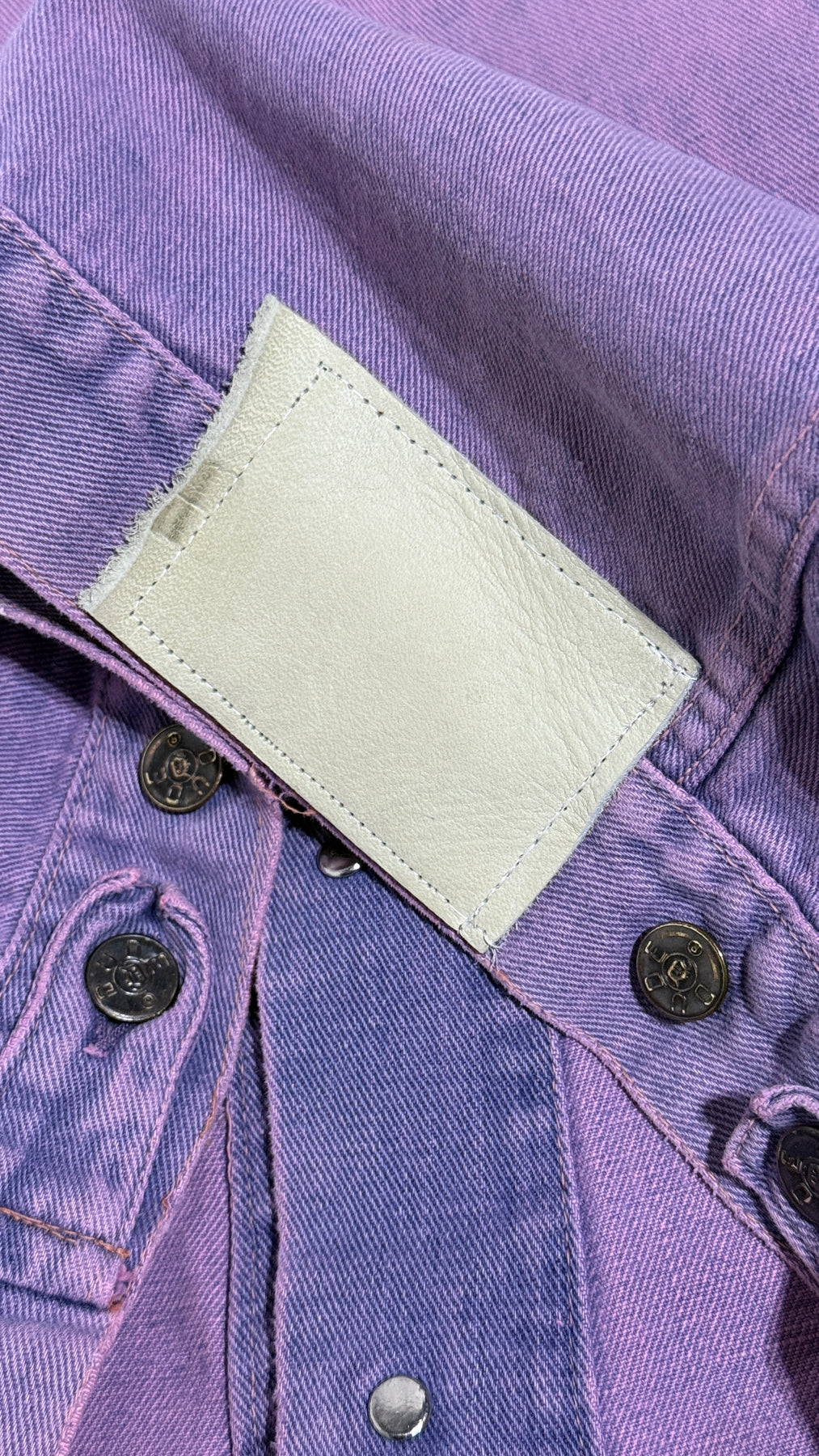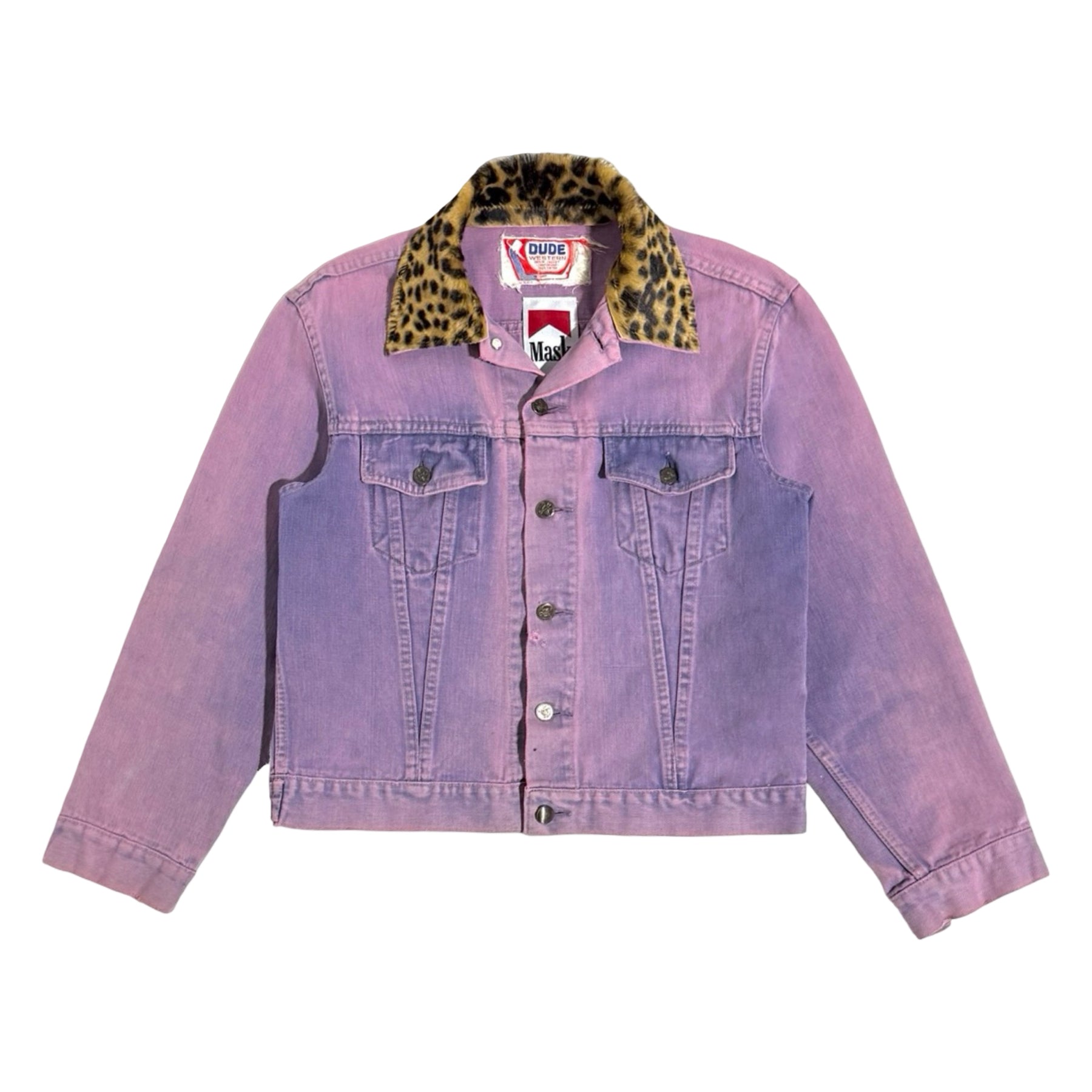 1970’S MASK X DUDE WESTERN MADE IN USA CROPPED LEOPARD LEATHER COLLAR OVERDYE DENIM TRUCKER JACKET MEDIUM