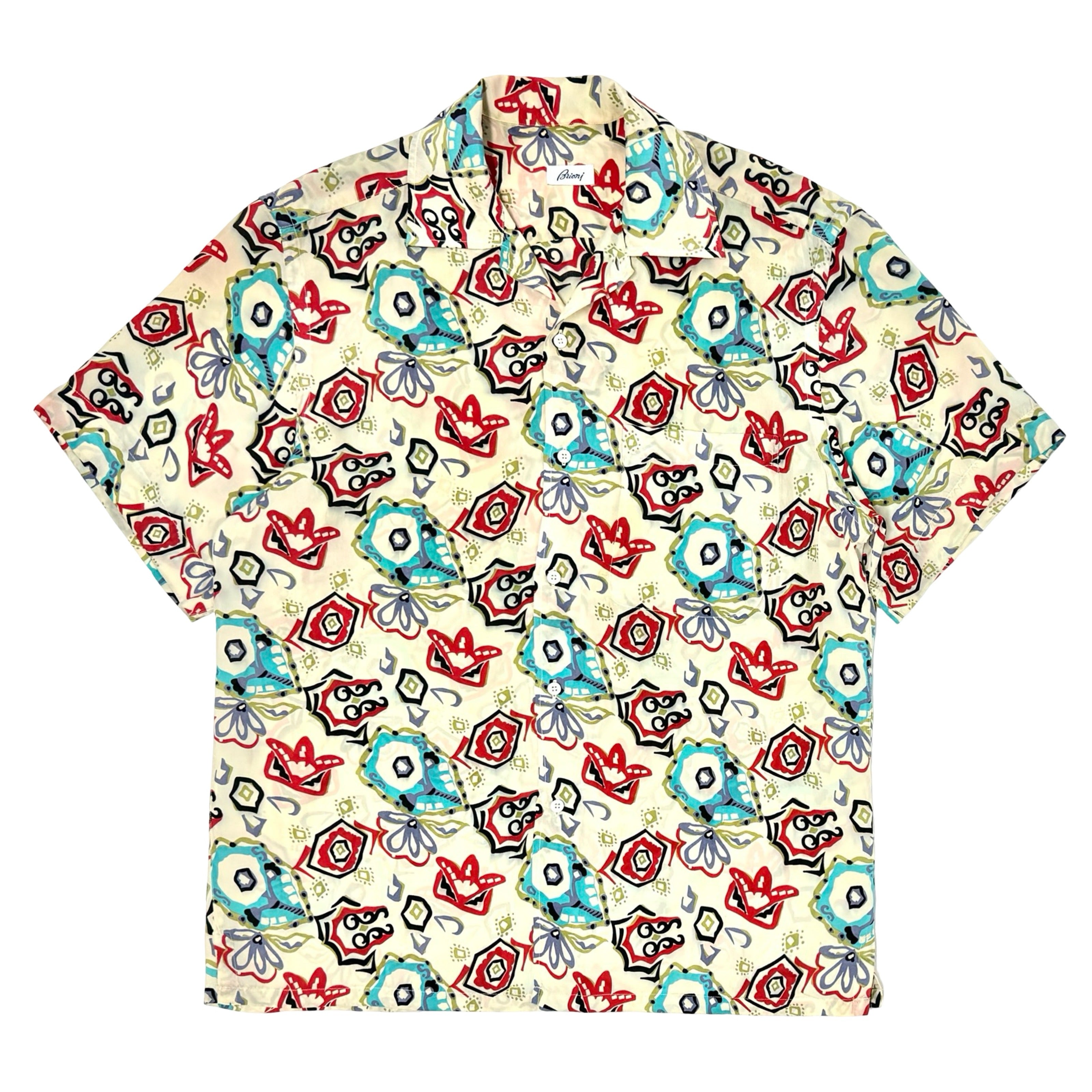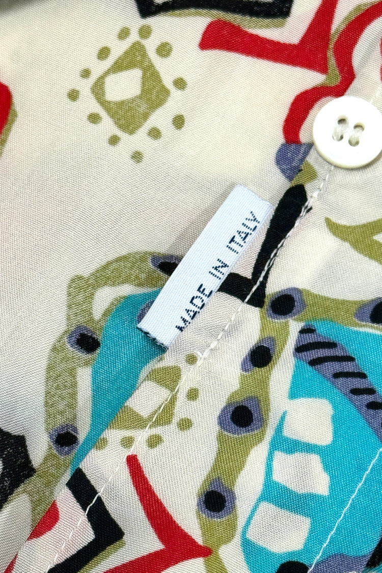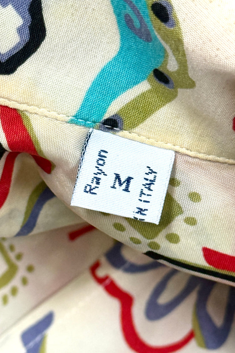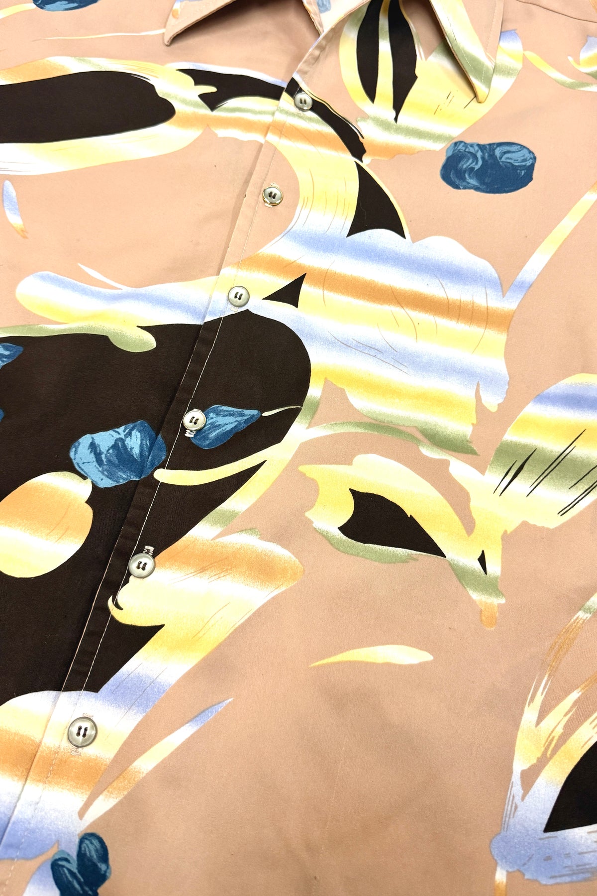 1950’S DONEGAL MADE IN USA SUN FADED CROPPED DRAPEY SELVEDGE RAYON EMBROIDERED LOOP COLLAR S/S B.D. SHIRT MEDIUM