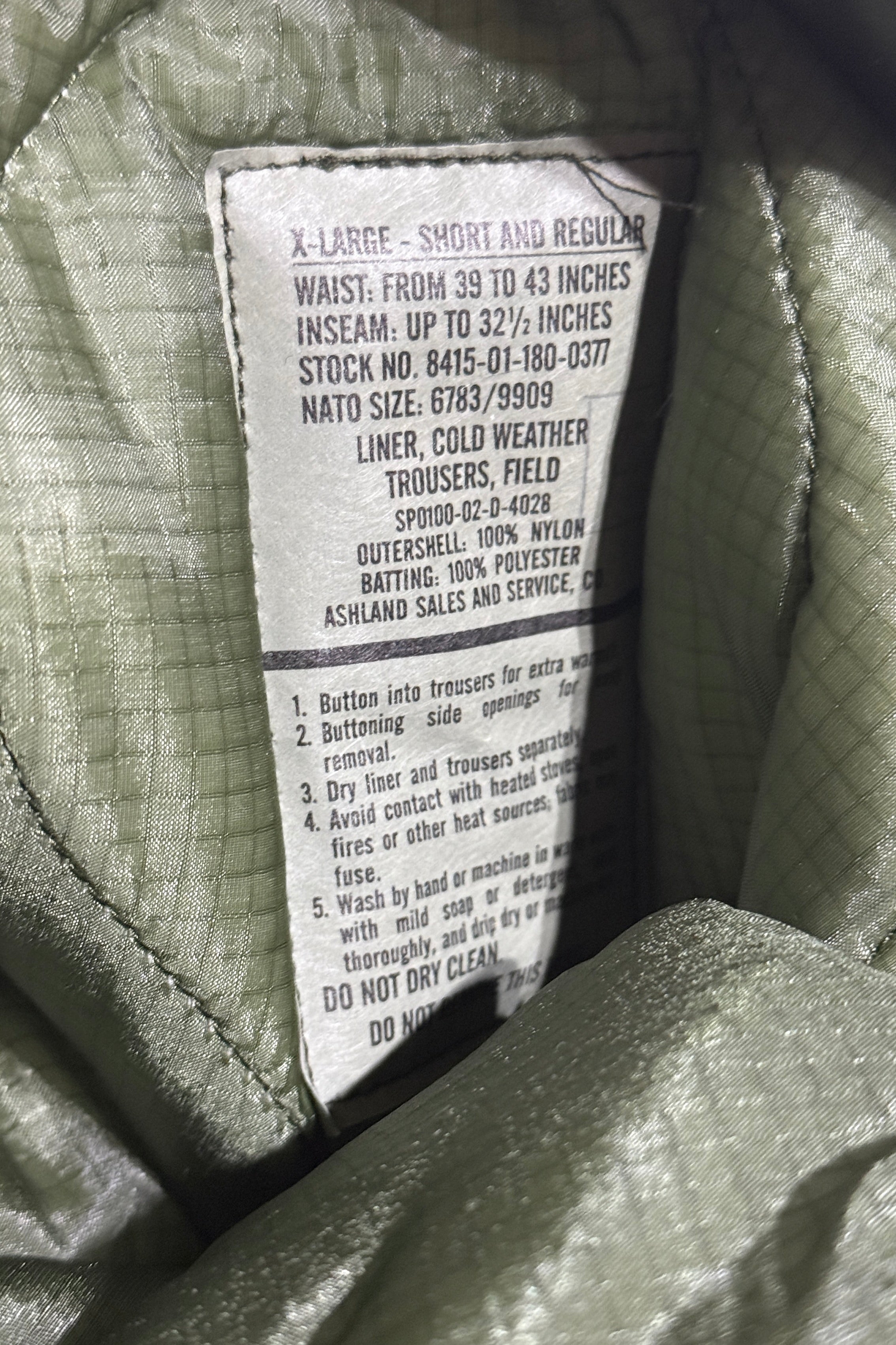 2000’S DEADSTOCK US ARMY MADE IN USA OLIVE QUILTED LINER PANTS X-LARGE