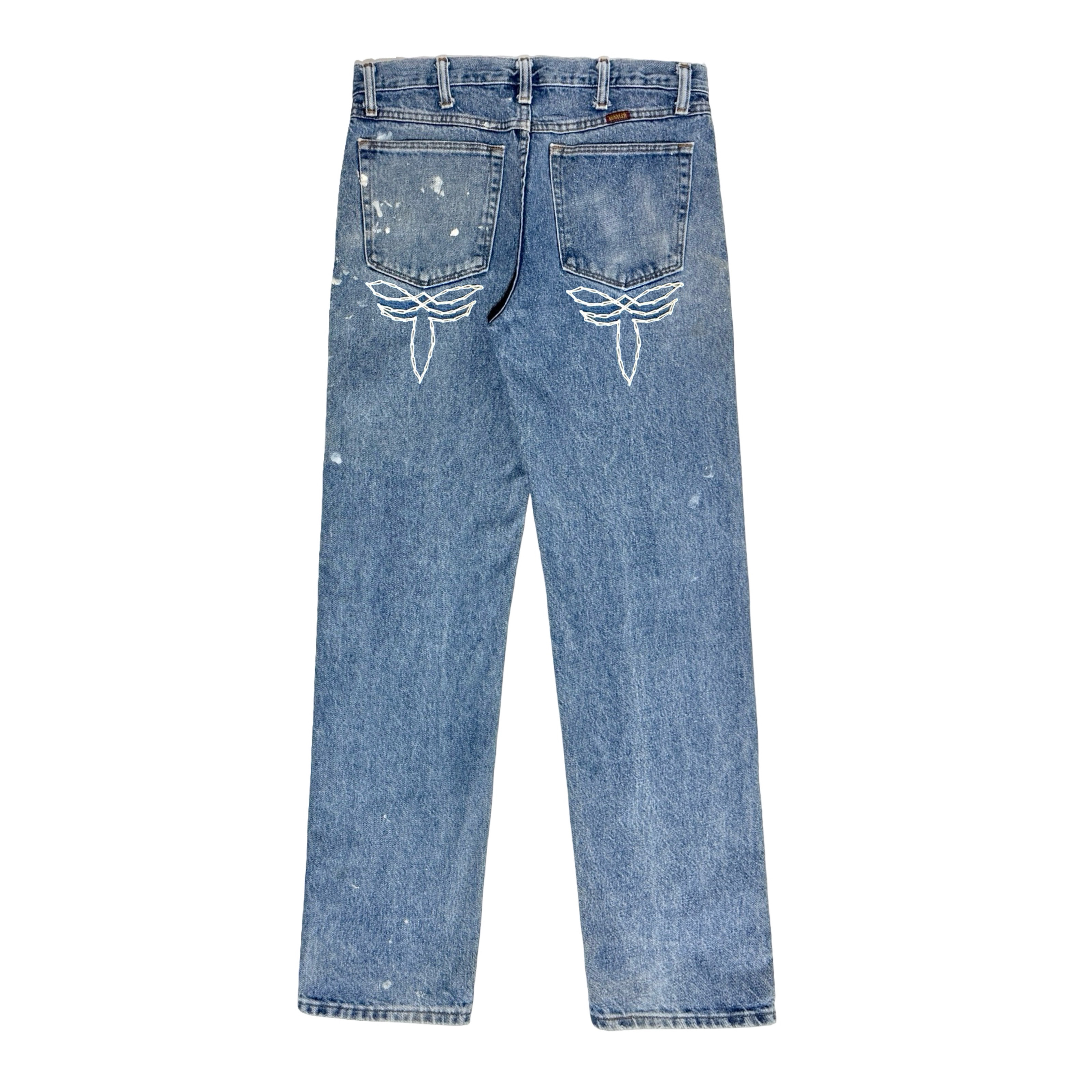 MASK X RUSTLER HAND CHAINSTITCHED WESTERN MADE IN USA THRASHED & FADED LIGHT WASH COWBOY CUT DENIM JEANS 34 X 30