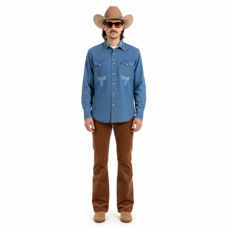MASK X WRANGLER MADE IN USA HAND CHAINSTITCHED WESTERN MEDIUM WASH FADED WESTERN DENIM L/S B.D. SHIRT S-XXL