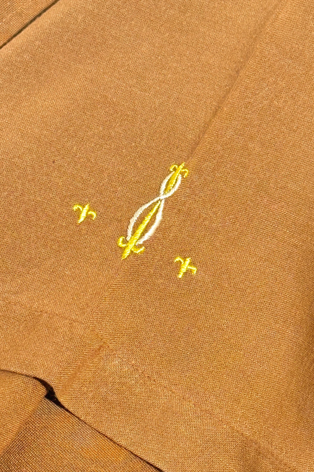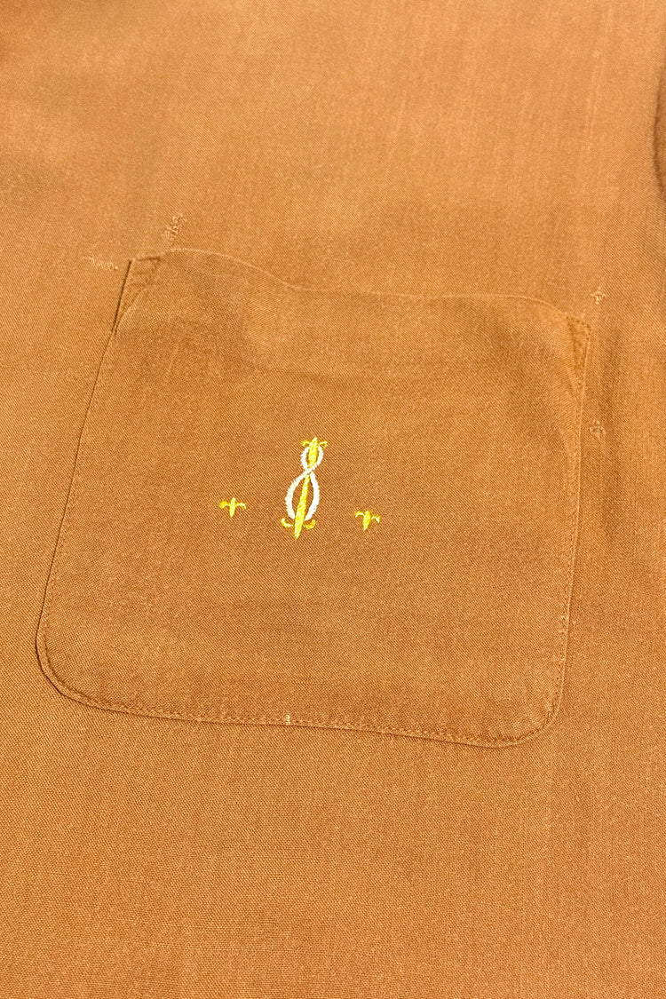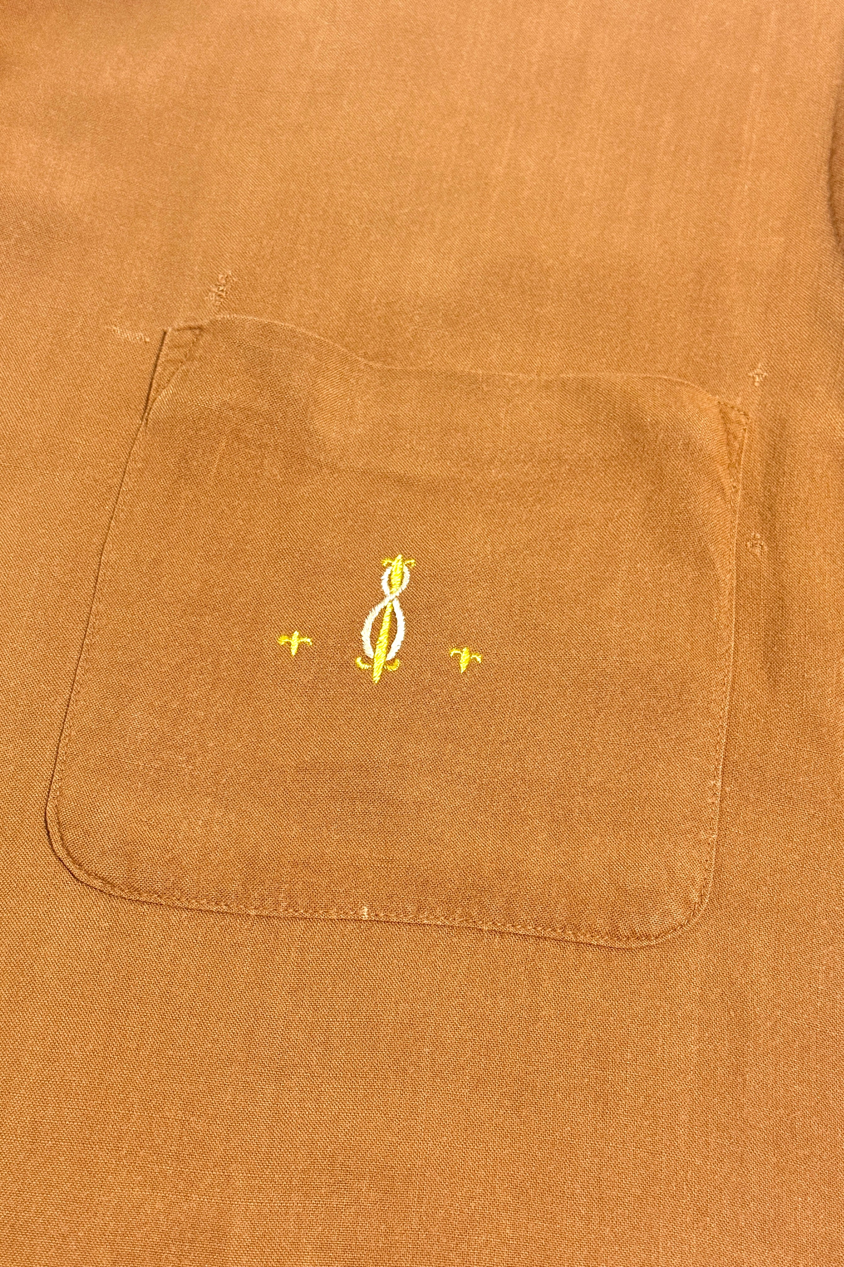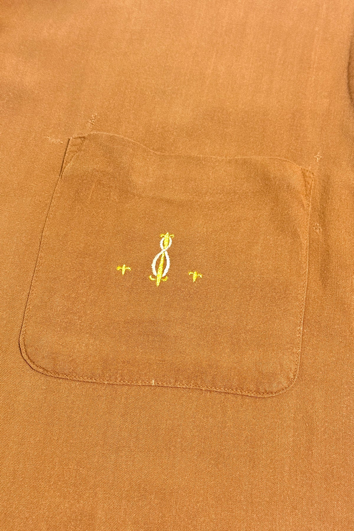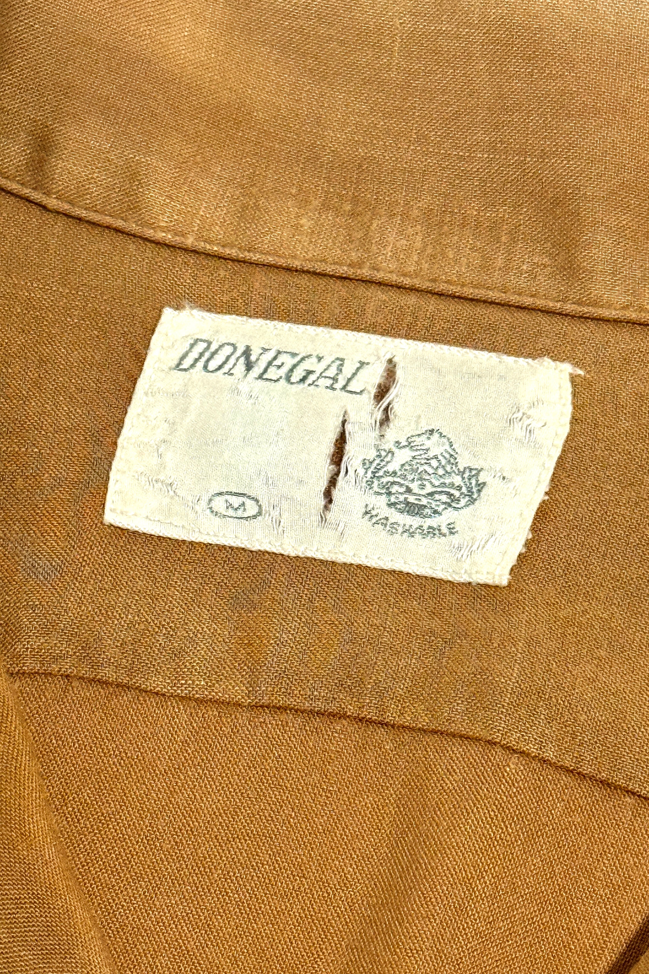 1950’S DONEGAL MADE IN USA SUN FADED CROPPED DRAPEY SELVEDGE RAYON EMBROIDERED LOOP COLLAR S/S B.D. SHIRT MEDIUM
