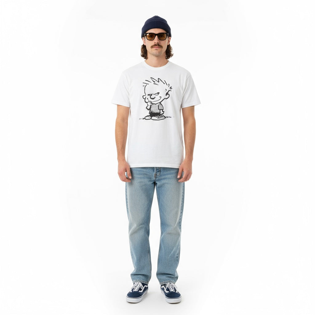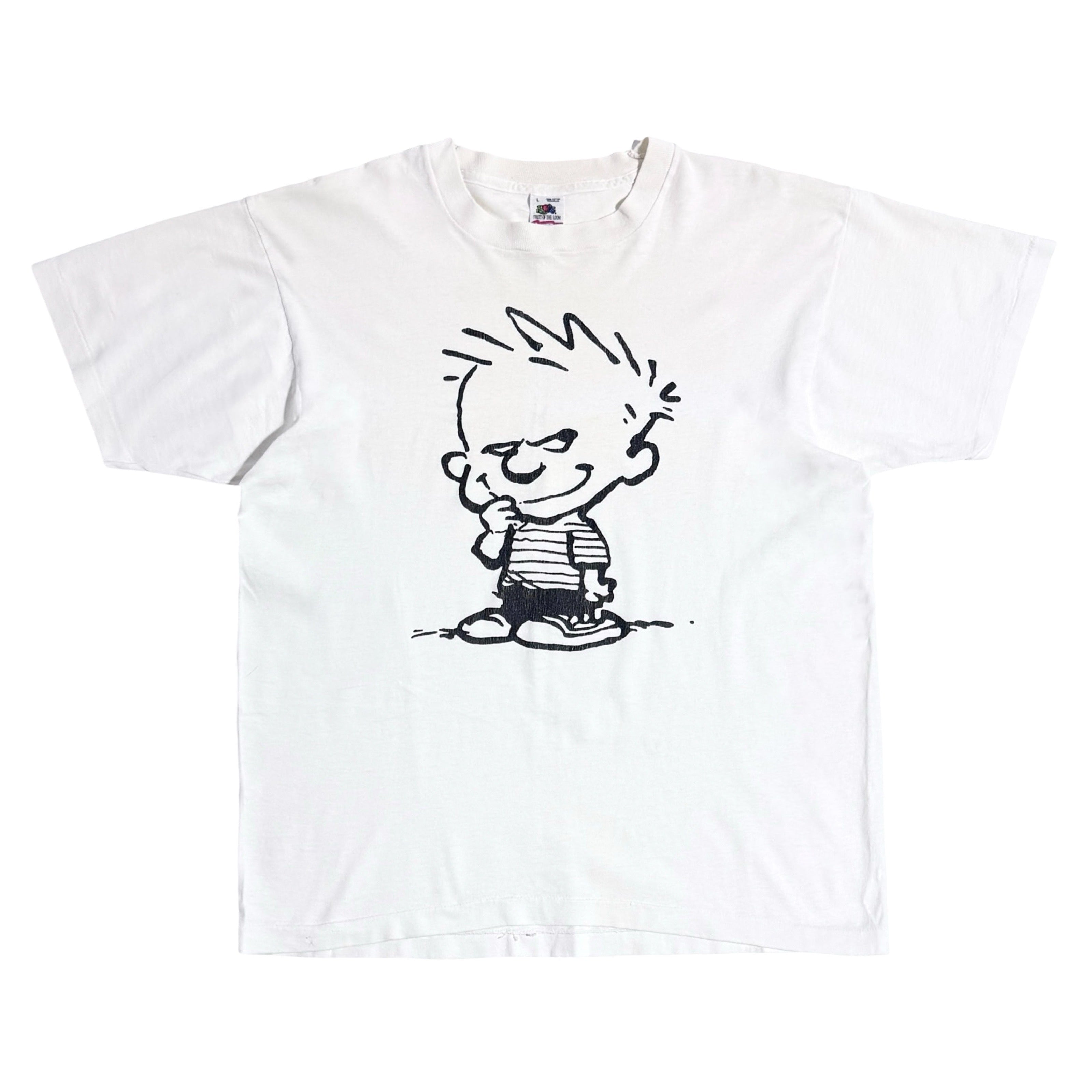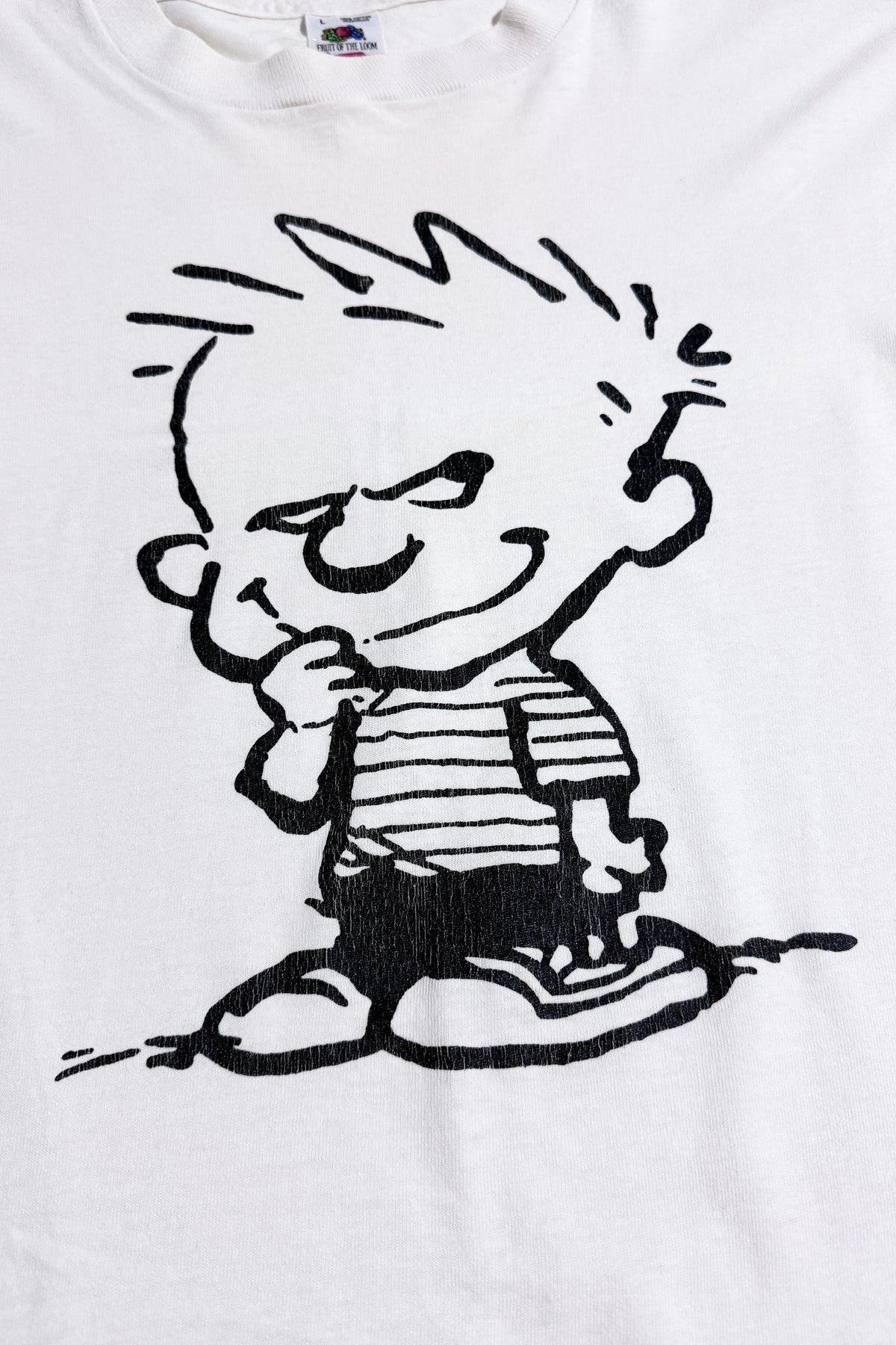 1990’S MISCHIEVOUS CALVIN & HOBBES MADE IN USA SINGLE STITCH WHITE JERSEY S/S T-SHIRT LARGE