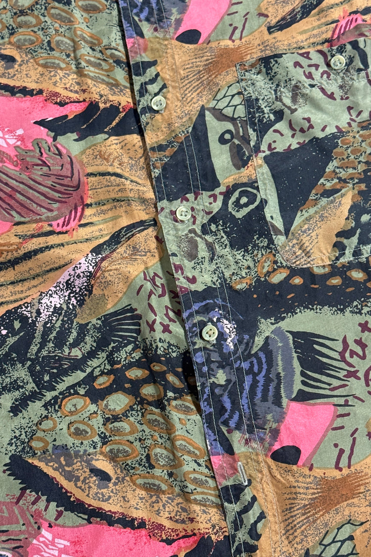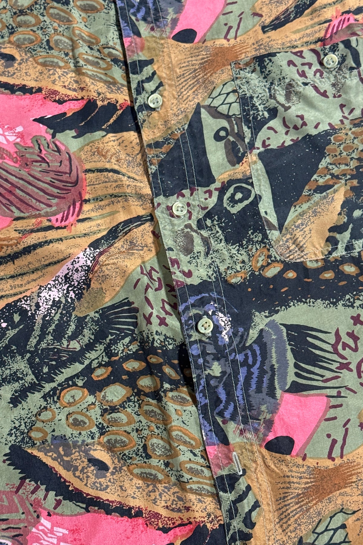 1960’S MASK HANDMADE FLORAL PRINTED SEERSUCKER SELVEDGE FLAP POCKET LOOP COLLAR S/S B.D. SHIRT LARGE